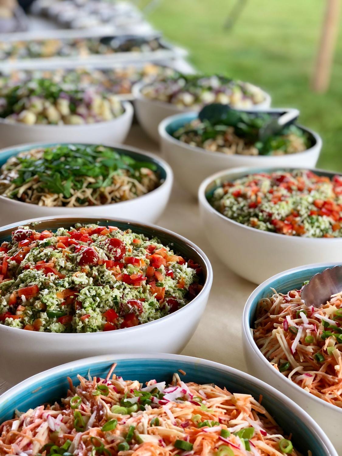 Slamix - Geraspte wortelen - Komkommerschijfjes - Tomaat - Bloemkool - Broccoli - Prinsessenboontjes en 3 koude sauzen
